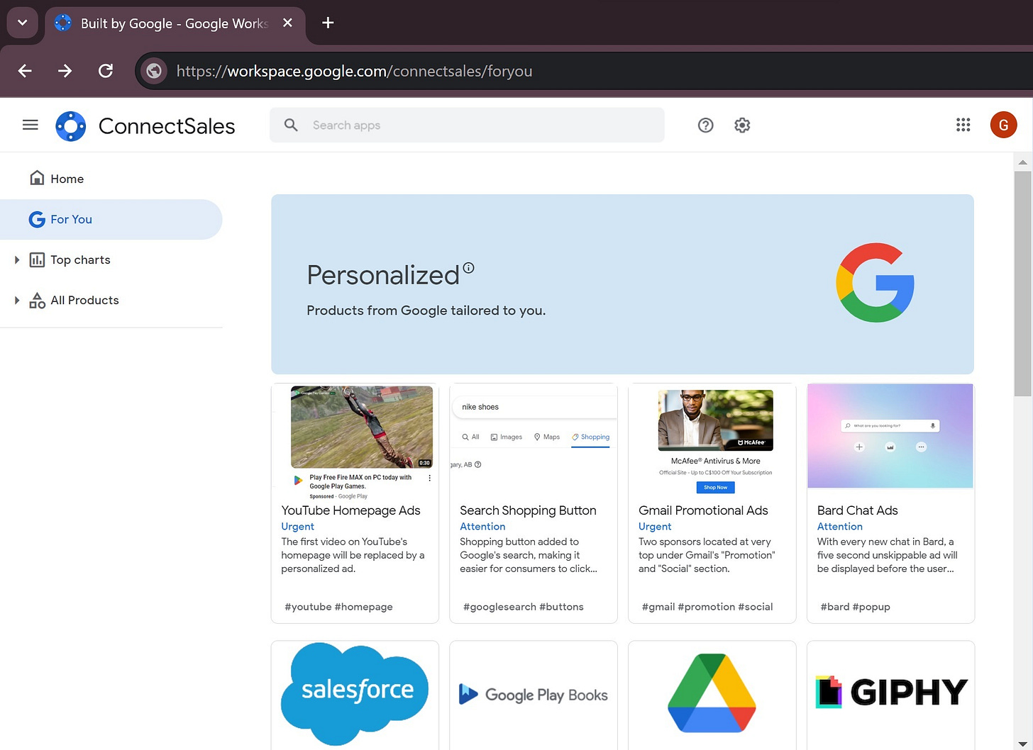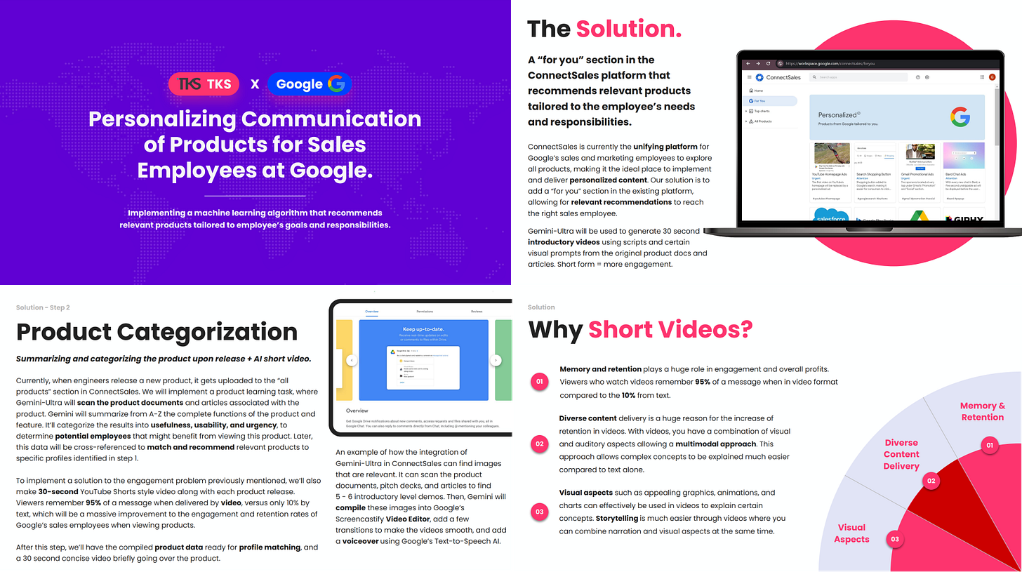 So my solution? A “for you” section in their ConnectSales platform that recommends relevant products tailored to the employee’s needs and responsibilities. ConnectSales is currently the unifying platform for Google’s sales and marketing employees to explore all products, making it the ideal place to implement and deliver personalized content. We prototyped a “for you” section in the existing platform, allowing for relevant recommendations to reach the right sales employee.